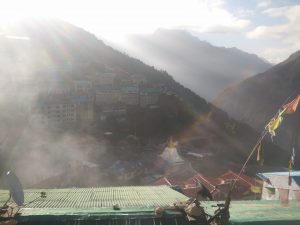 The first light of the day shines through the window driving my sight towards the Namche Bazaar landscape.